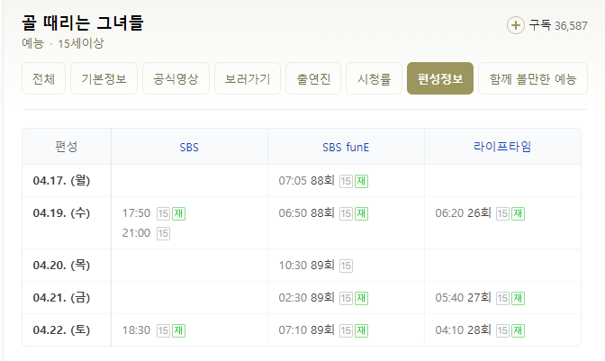 재방송 TV 채널은 3개입니다. 채널은 sbs, sbs funE, 라이프타임입니다.