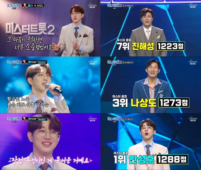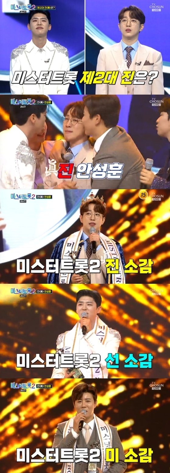 ‘미스터트롯 2’ 최종 순위 결과는 7위 박성온, 6위 진욱, 5위 최수호, 4위 나상도, 3위 진해성, 2위 박지현, 1위 안성훈이다. ‘미스터트롯’ 시즌 1 탈락자에서 시즌 2 영광의 眞이 된 안성훈은 제작진과 마스터, 팬들에게 고마움을 보이며 “세상에서 가장 사랑하는 부모님, 낳아주시고 잘 키워주셔서 감사하고 사랑한다. 제가 가진 작은 재능으로 많은 분께 때로는 위로가, 때로는 행복을 드리는 가수가 되도록 평생 노력하겠다”라며 눈물을 보였다.